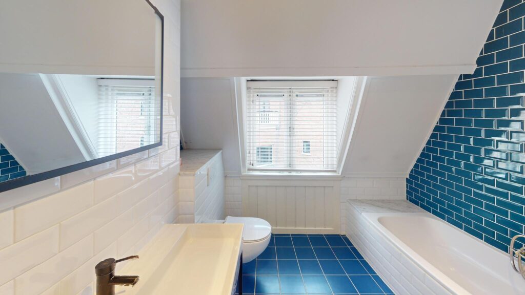 1e etage: overloop, 3 slaapkamers, kast met aansluiting wasmachine en cv-ketel, moderne badkamer met ligbad, inloopdouche, wastafel en toilet.