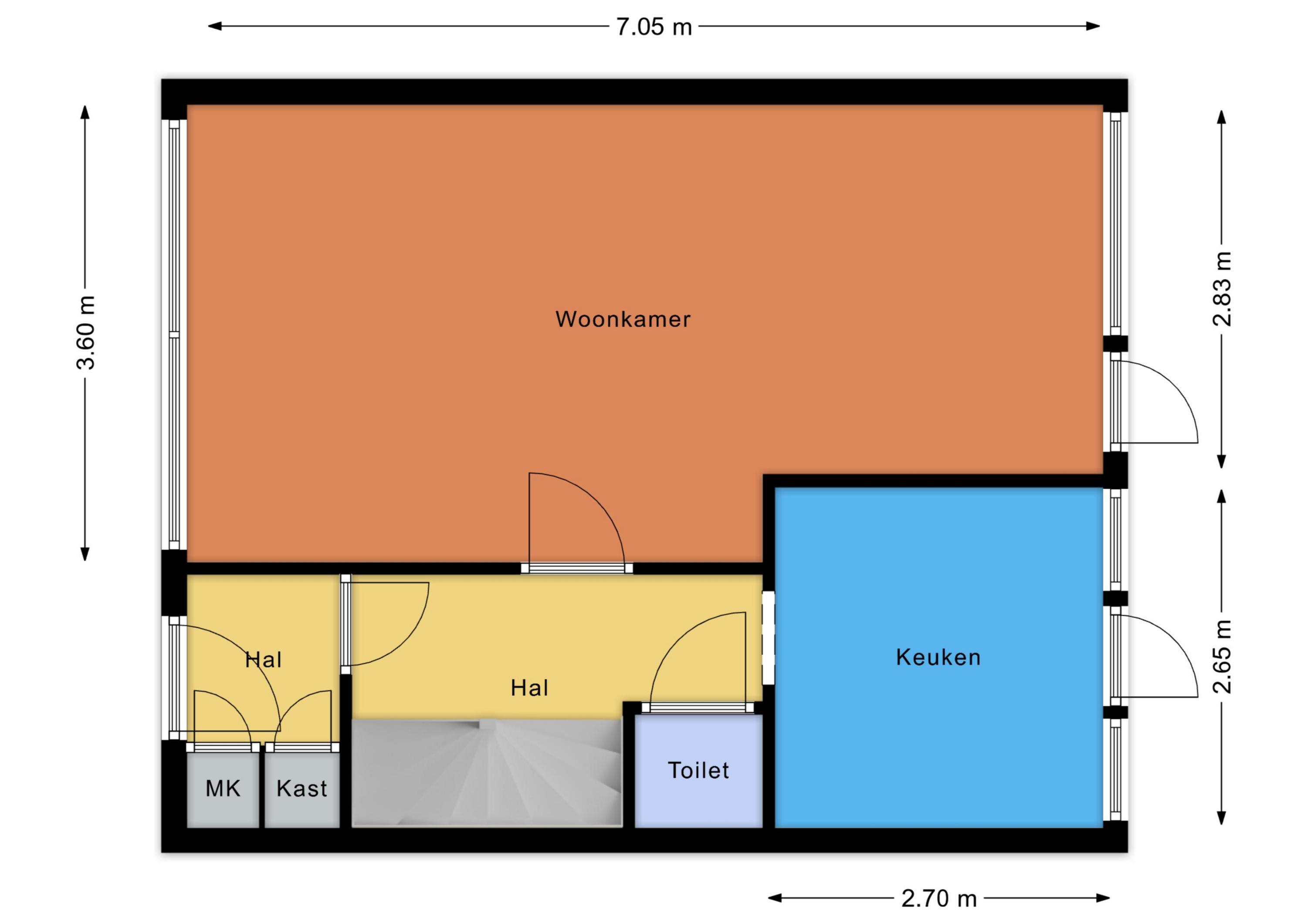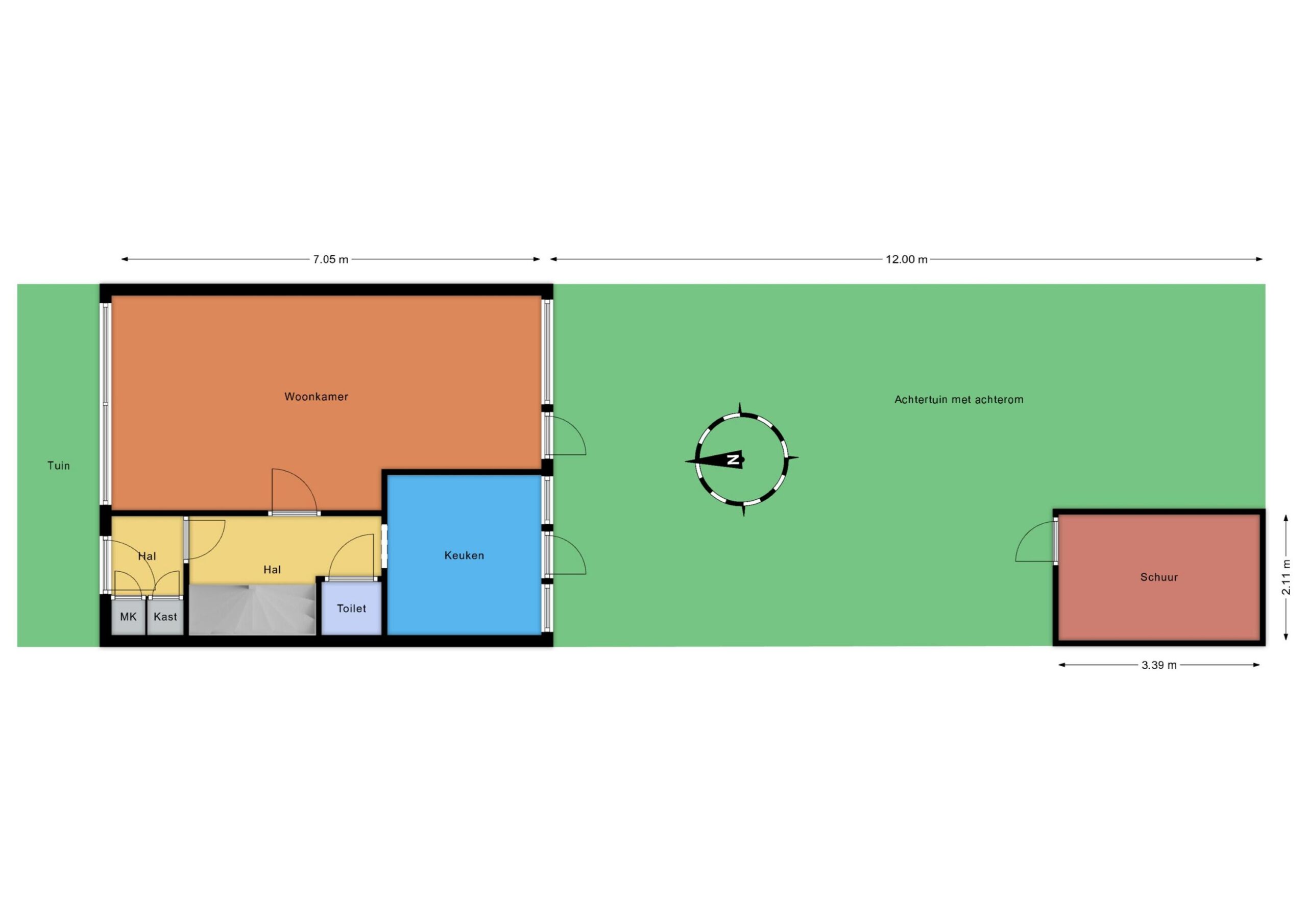 Parterre: entree, hal, toilet, ruime woonkamer, nette en ruime keuken, achtertuin op het zuiden met stenen schuur en achterom