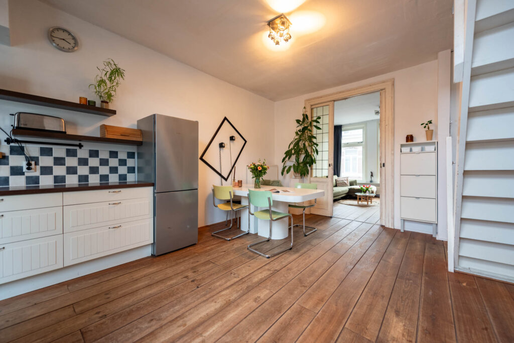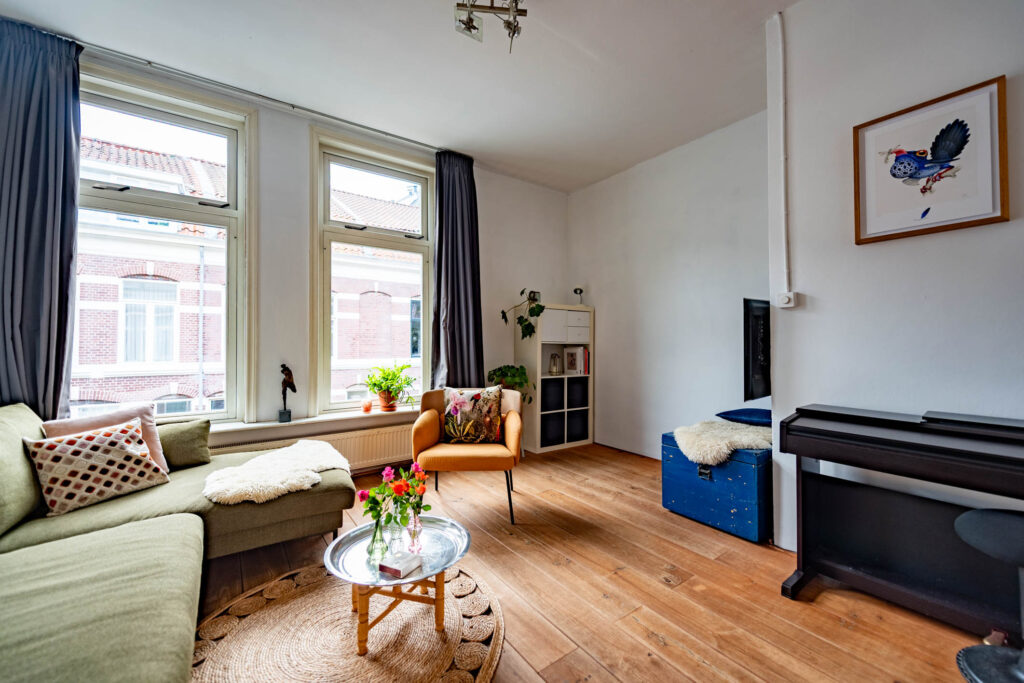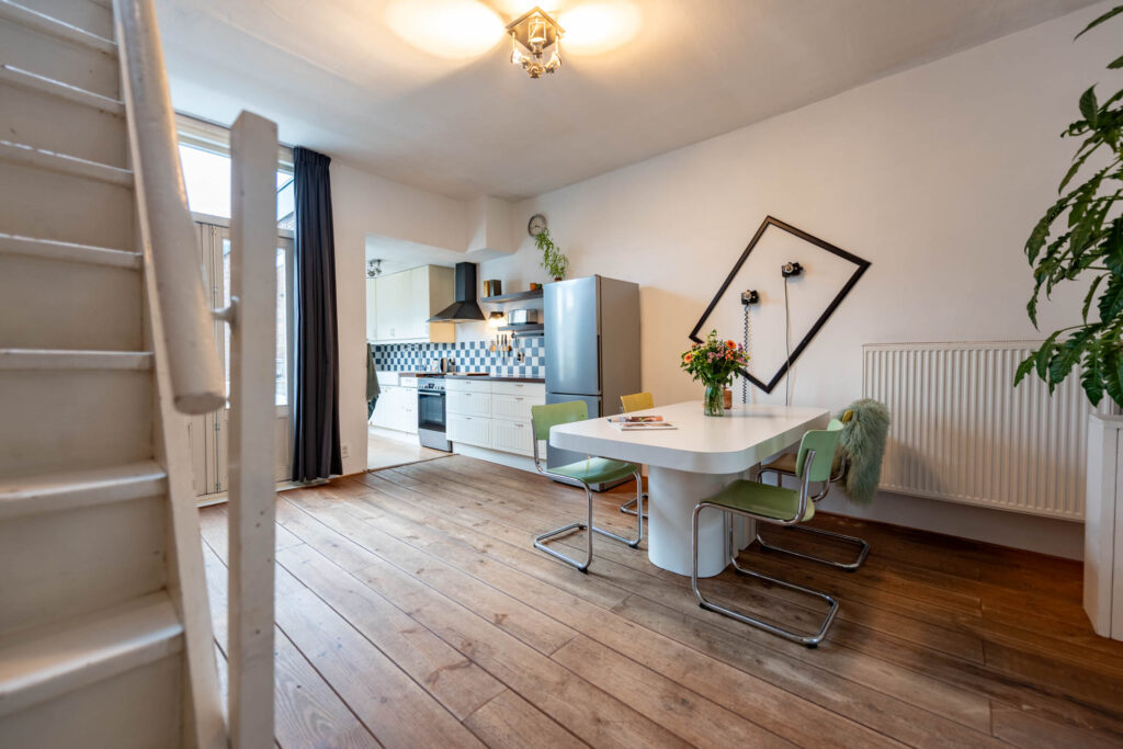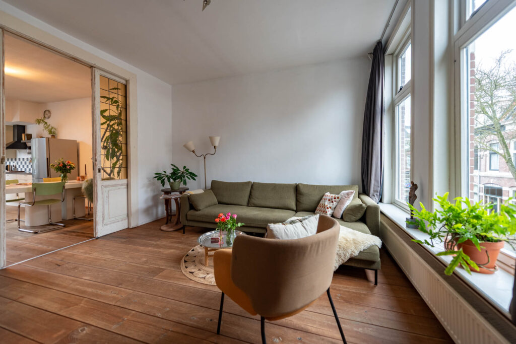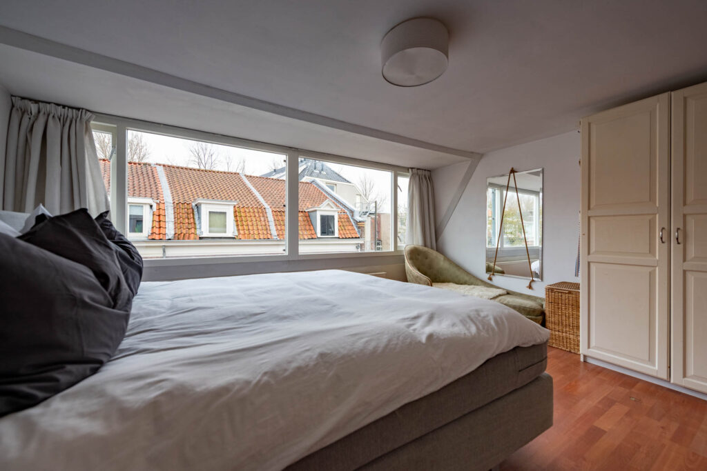 Ruime en lichte bovenwoning in de gewilde Leidsebuurt, ruime woonkamer-en-suite met open keuken, 3 slaapkamers, balkon op het noord-oosten.