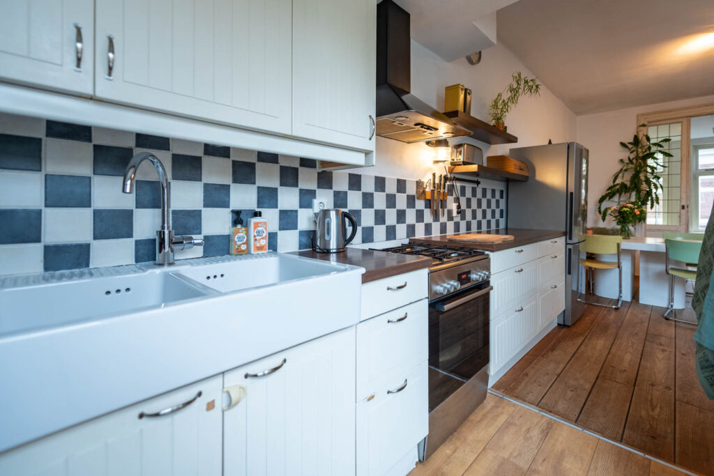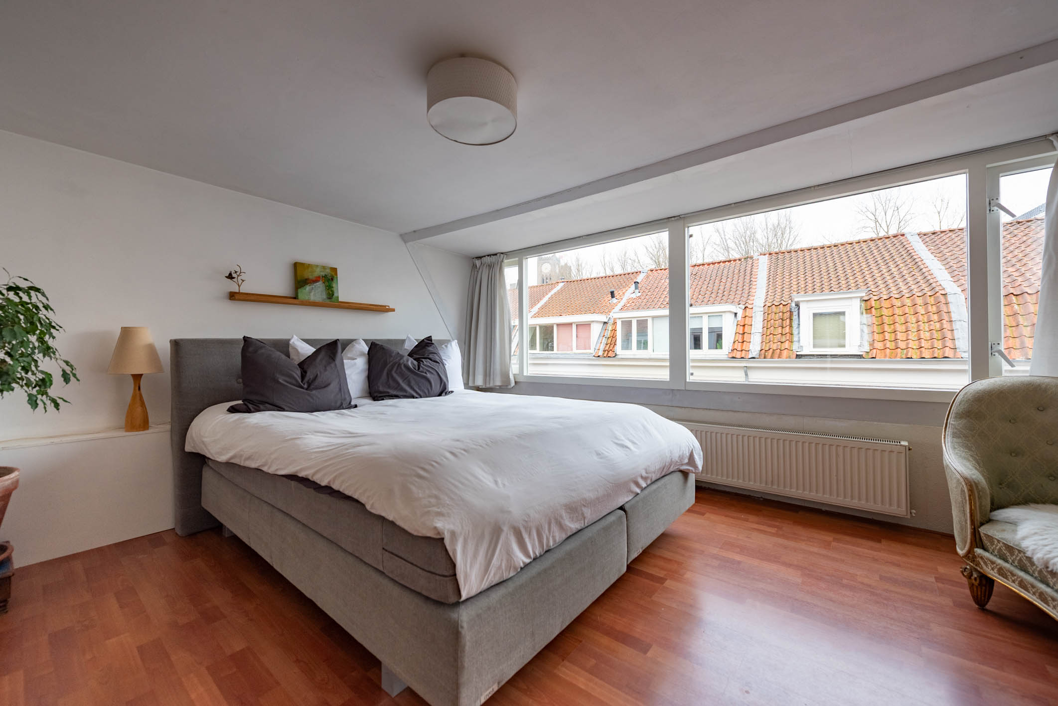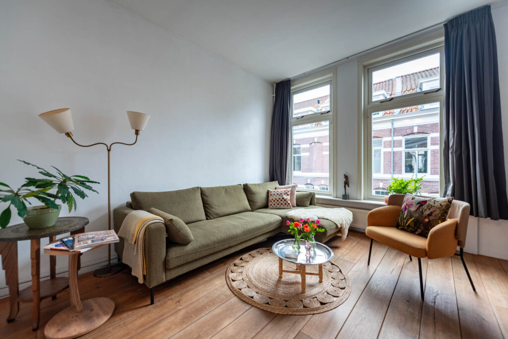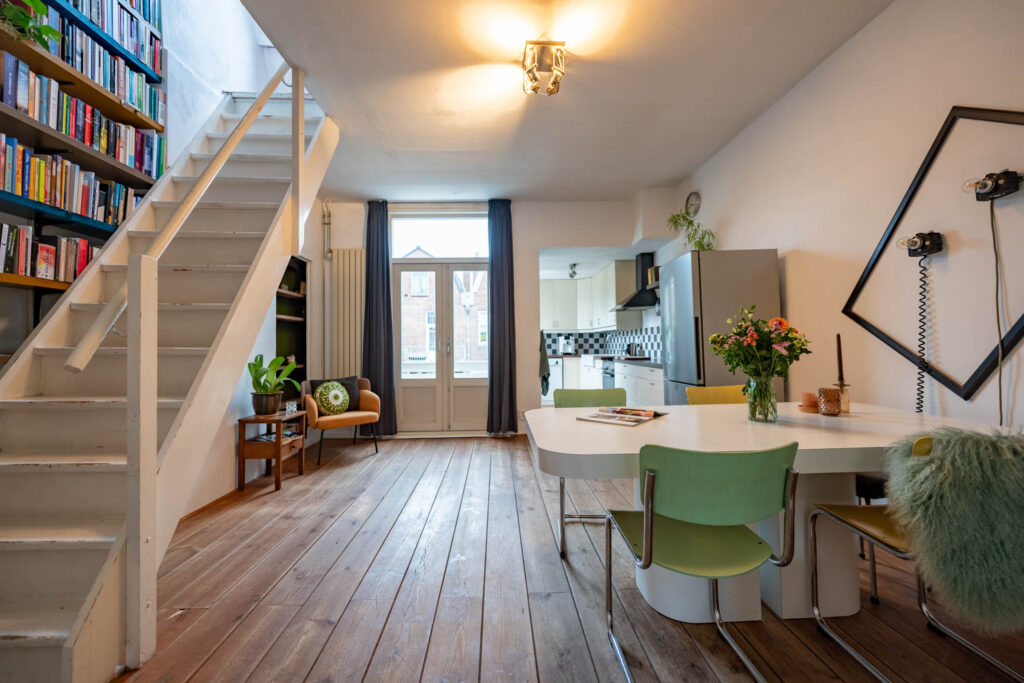 Ruime en lichte bovenwoning in de gewilde Leidsebuurt, ruime woonkamer-en-suite met open keuken, 3 slaapkamers, balkon op het noord-oosten.