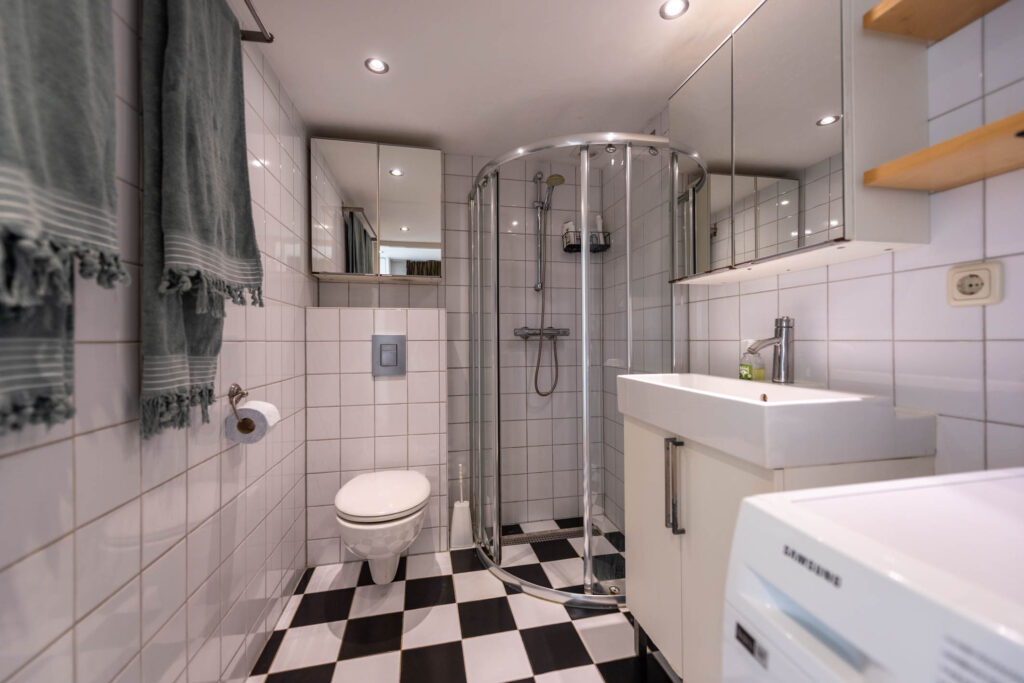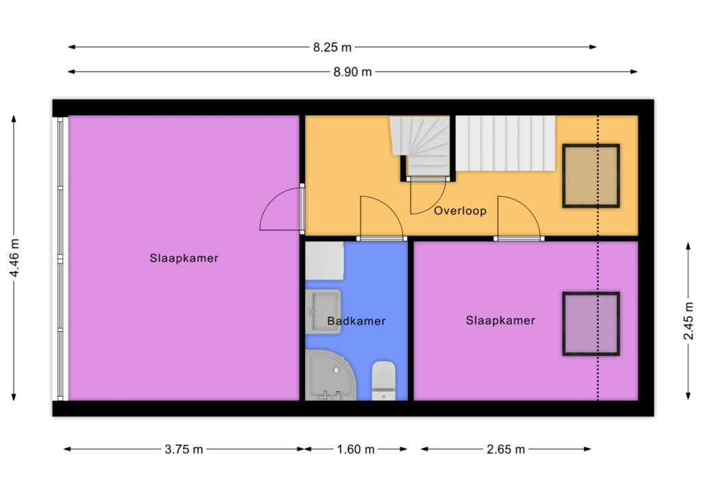 2e etage: overloop, badkamer met douche, wastafel en toilet, 2 slaapkamers