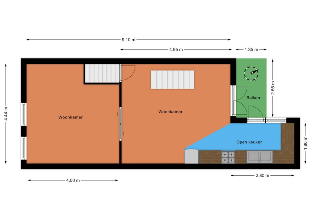 1e etage: woonkamer en suite, open keuken, balkon op het noord-oosten