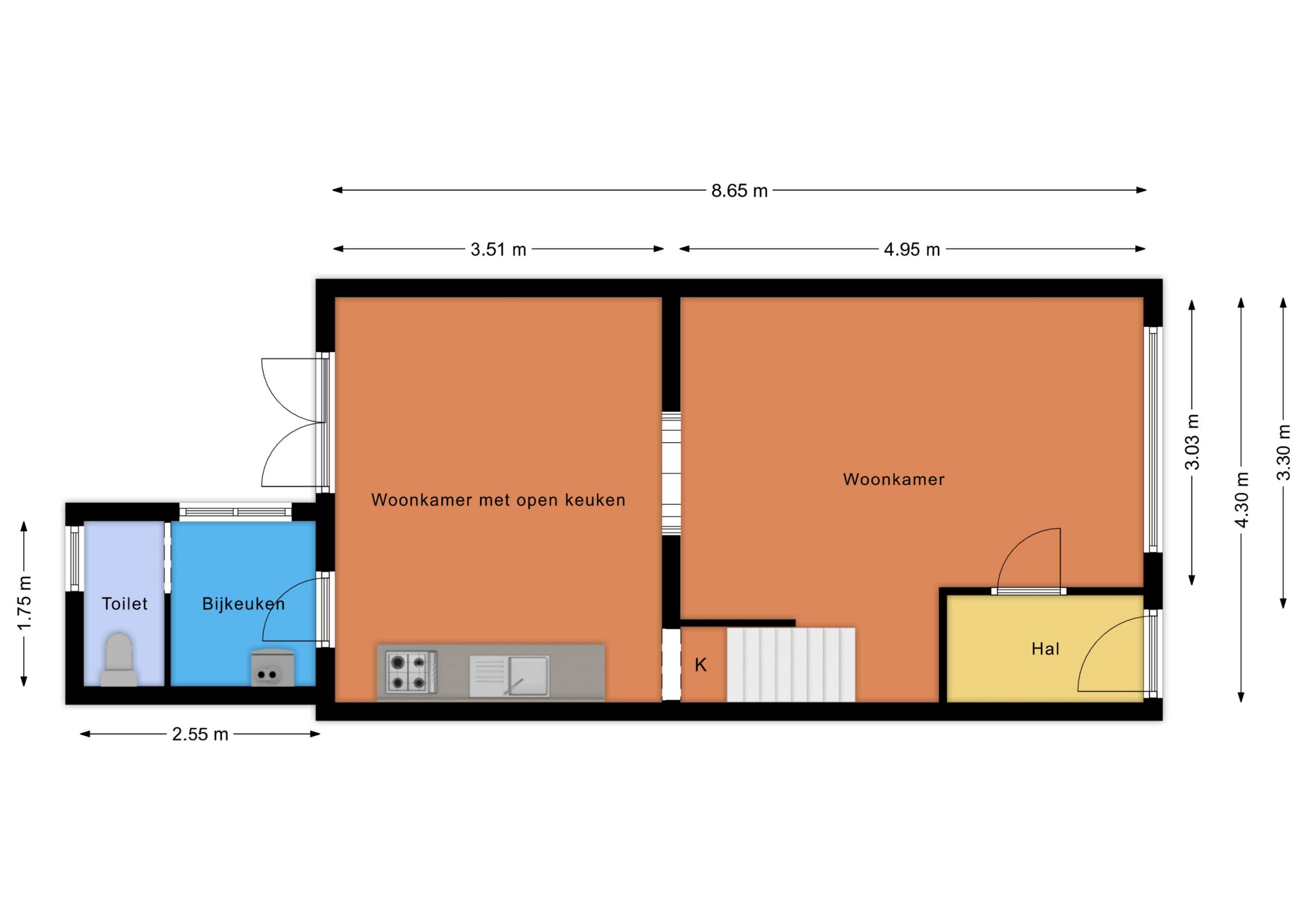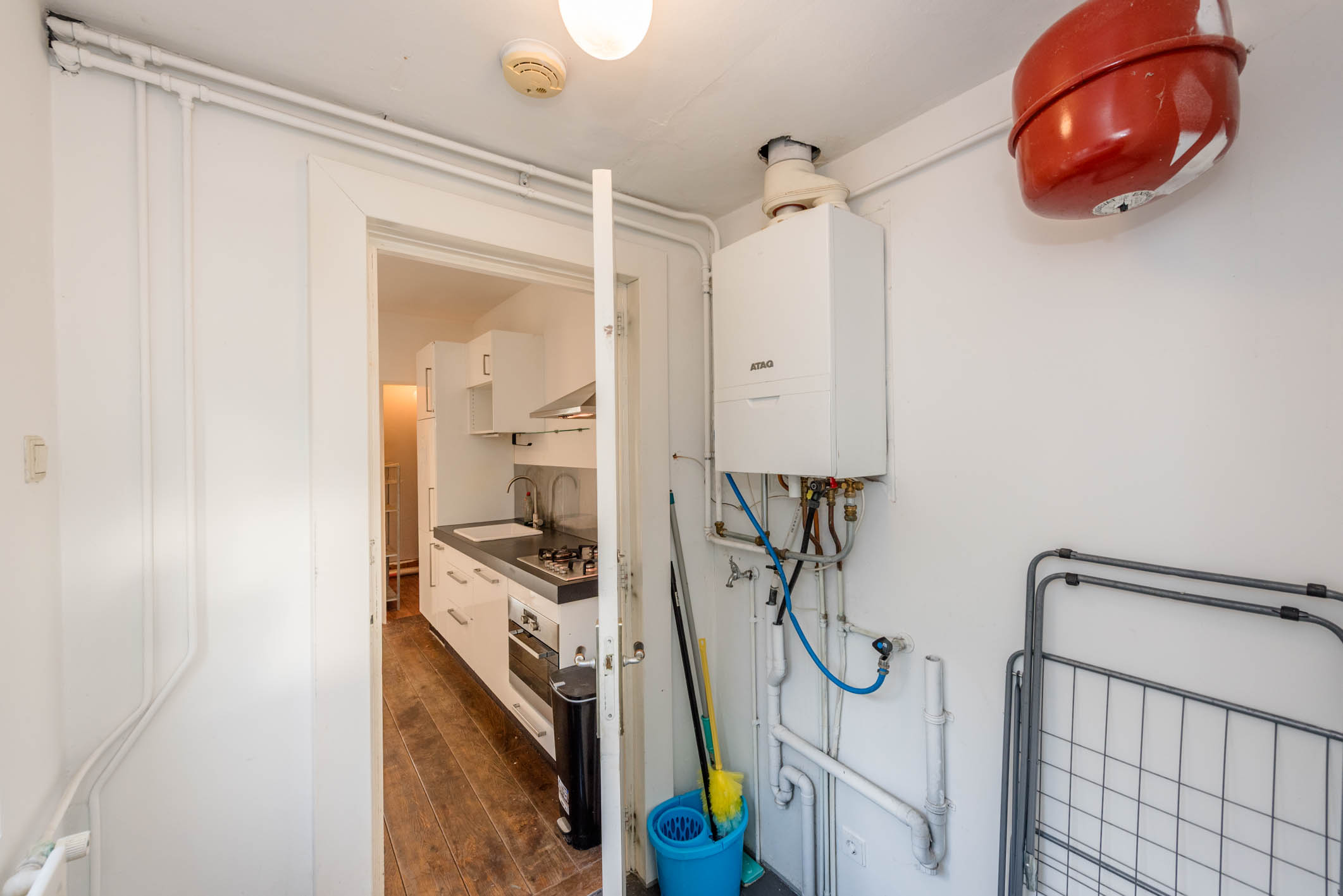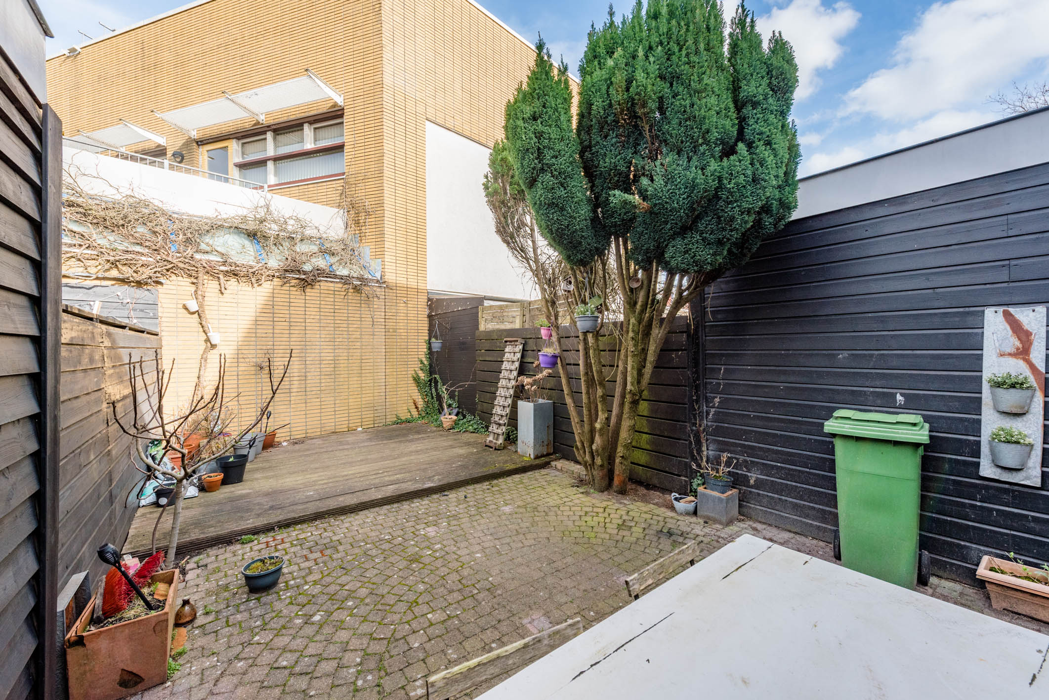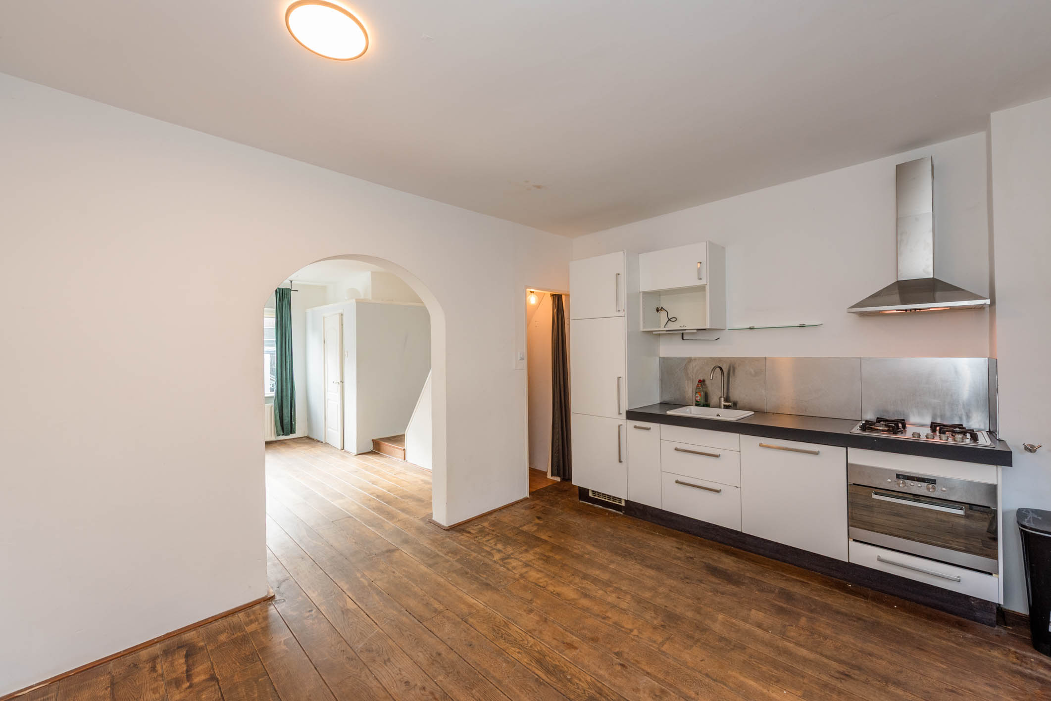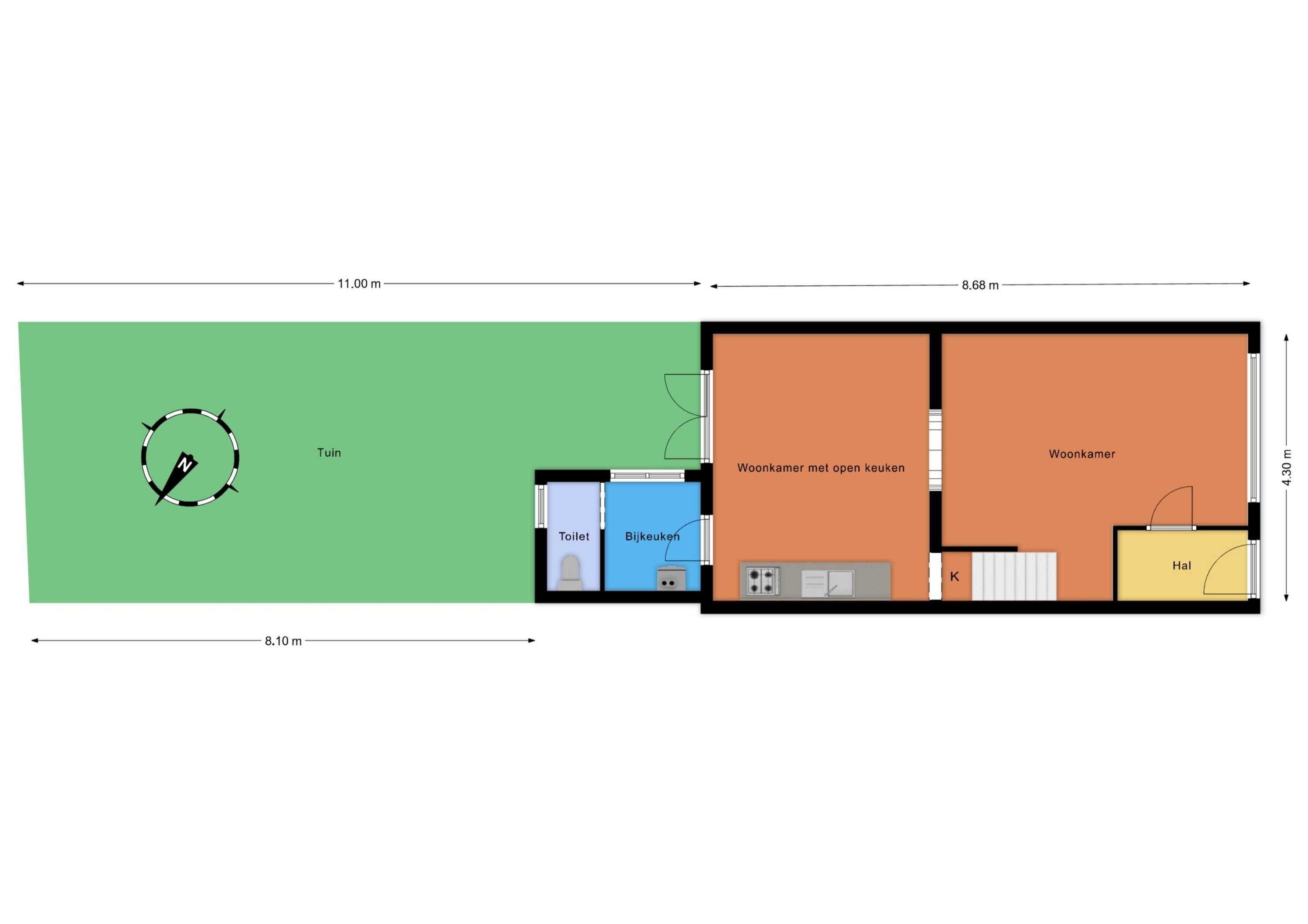 Parterre: entree, hal, voorkamer, achterkamer met open keuken en openslaande deuren naar de tuin, bijkeuken, toilet, achtertuin op het noord-oosten