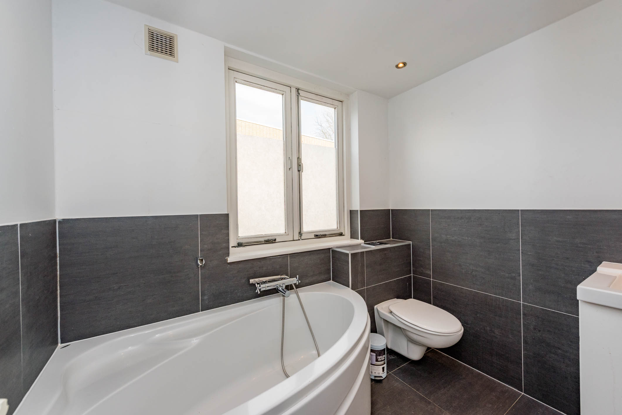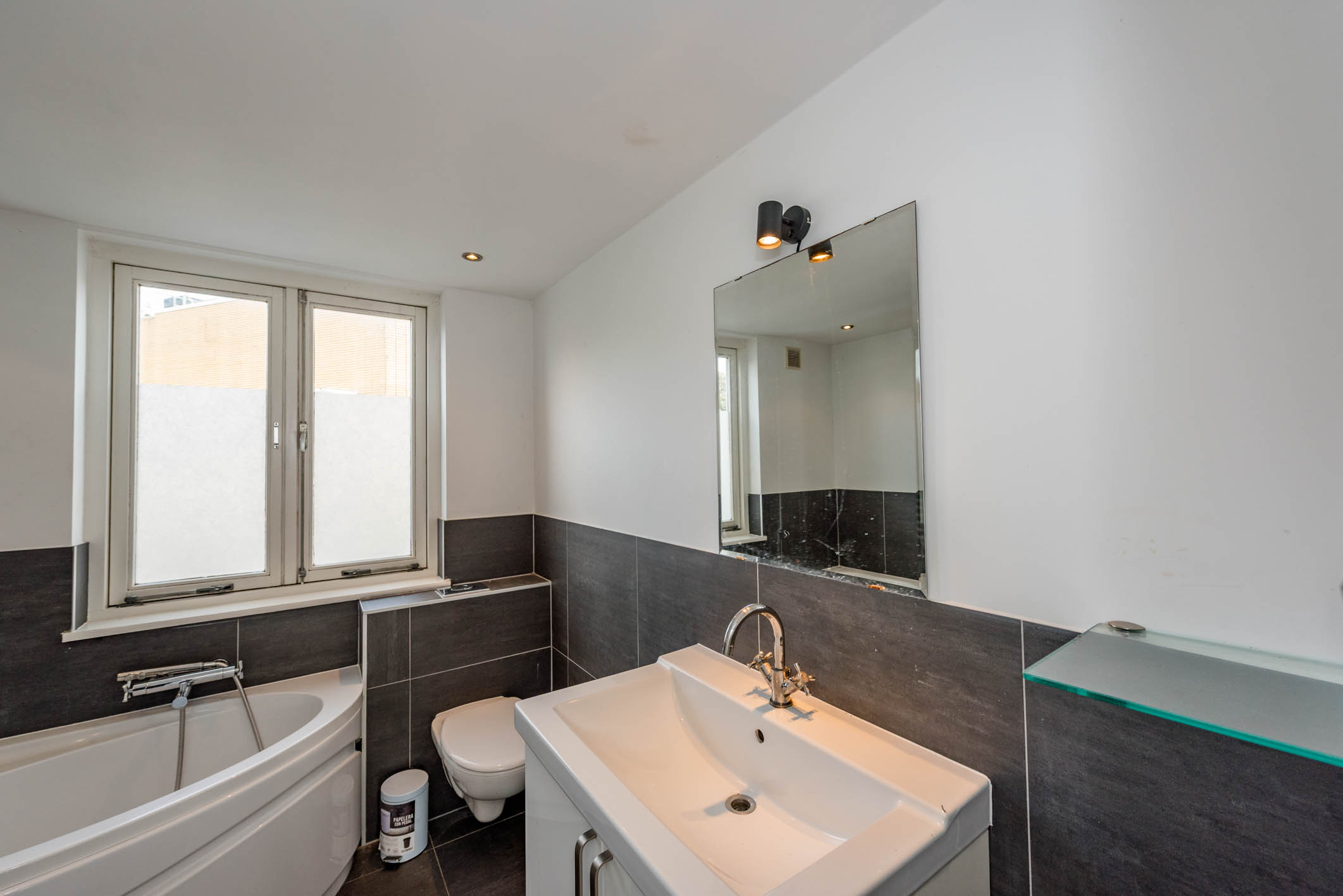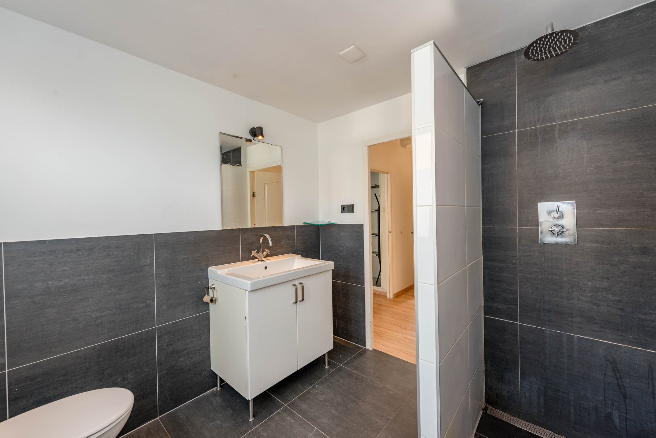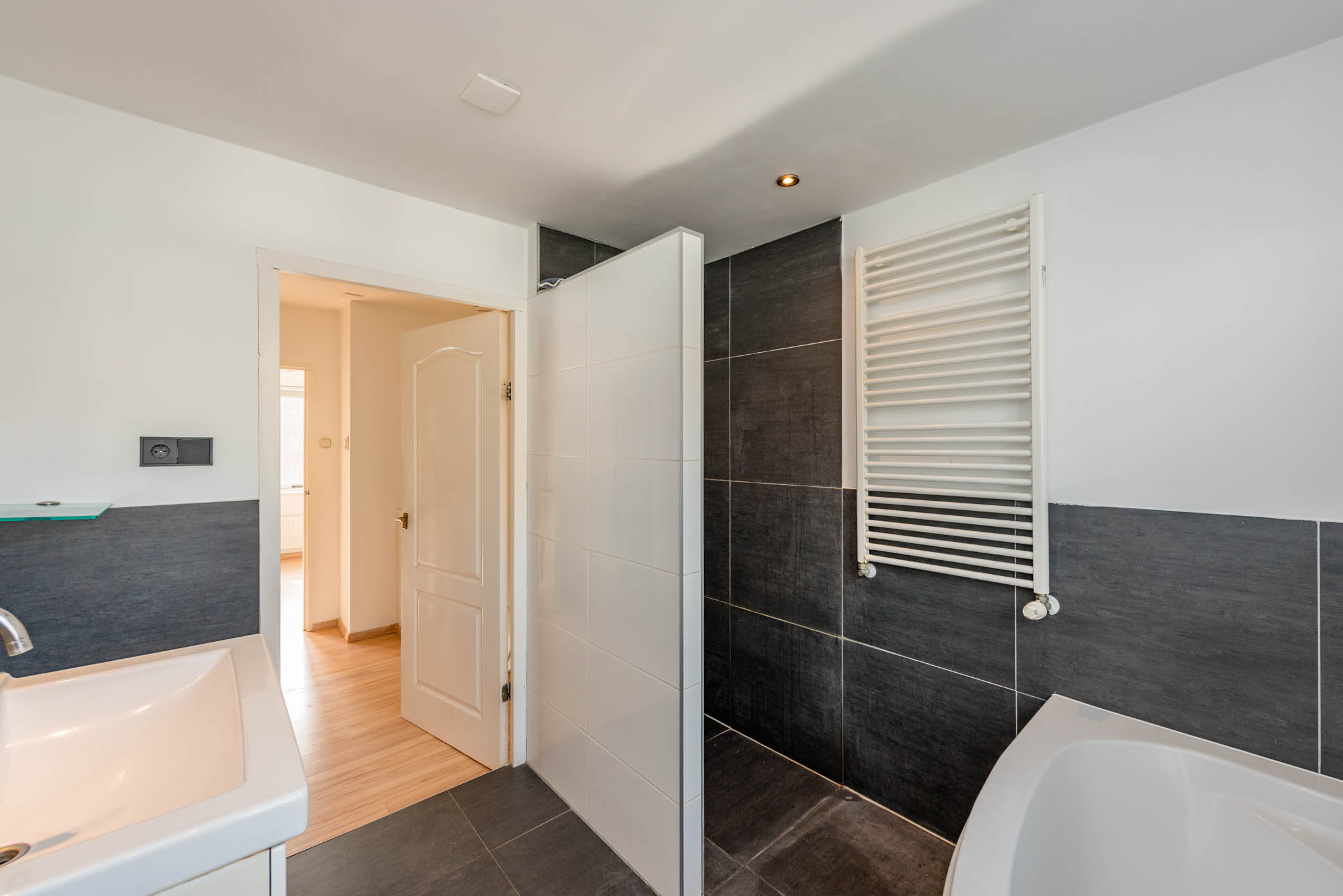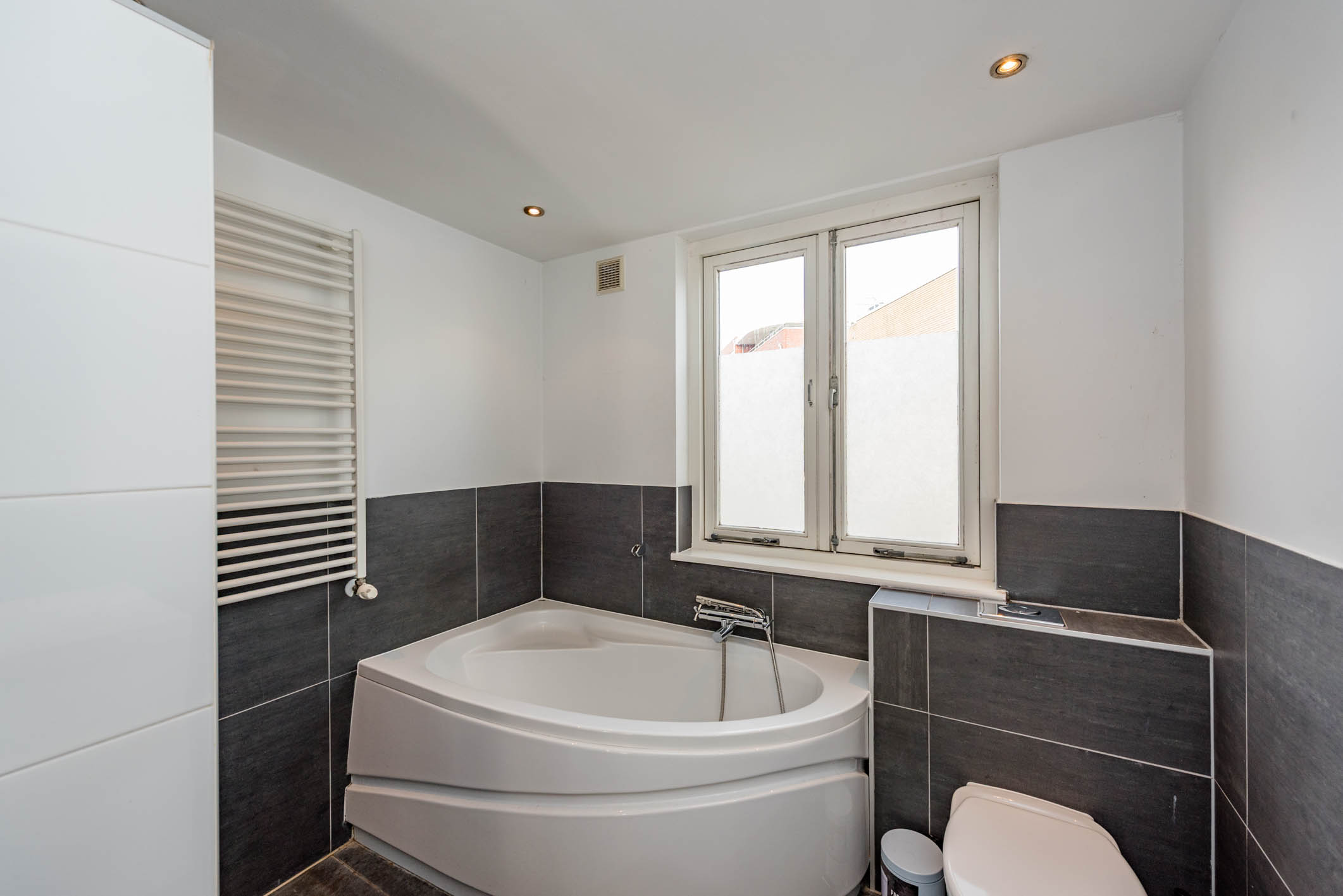 1e etage: overloop, 2 slaapkamers, badkamer met ligbad, inloopdouche, wastafel en toilet