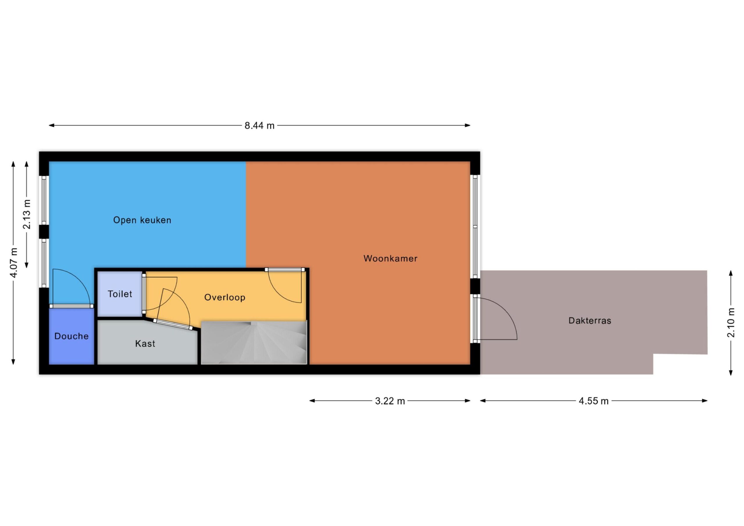 1e etage: overloop, toilet, woon/slaapkamer, open keuken, douche, dakterras op het westen