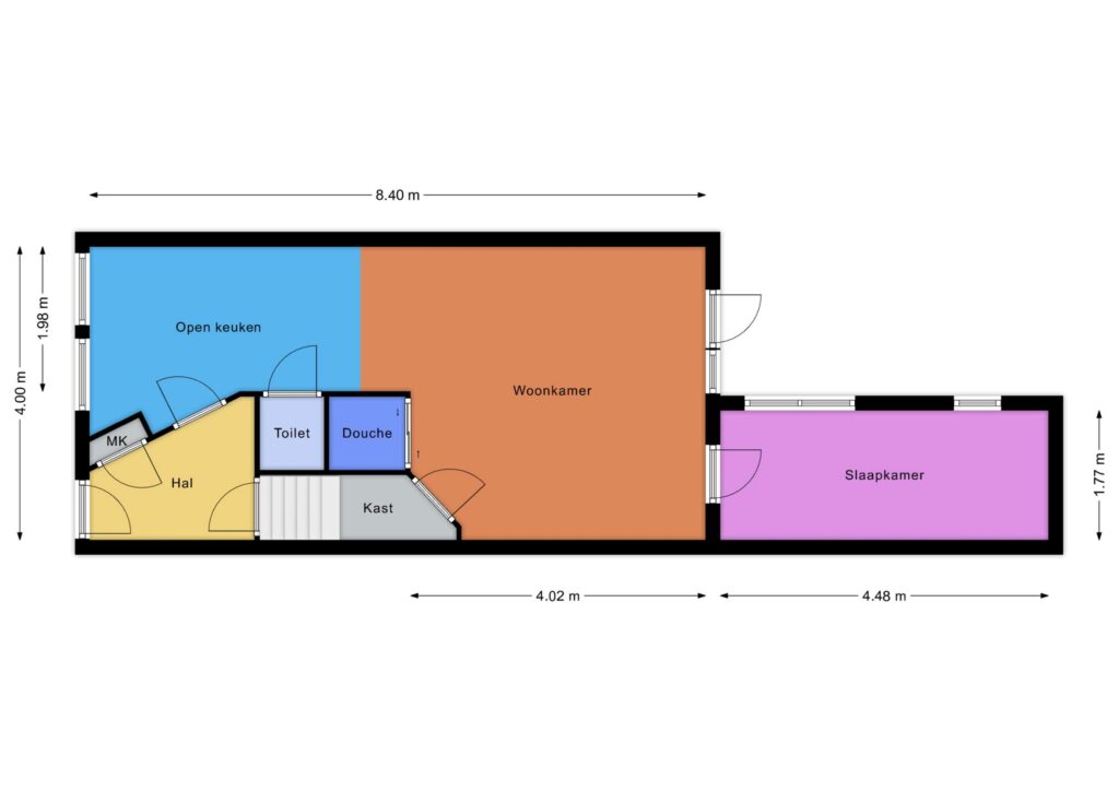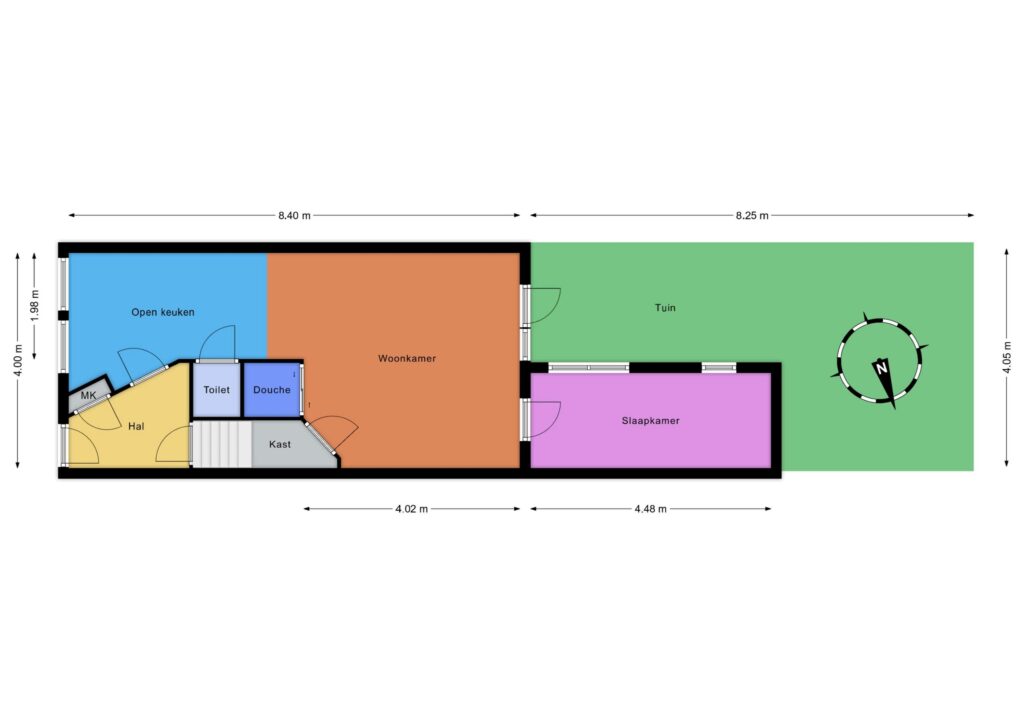 Parterre: entree, hal, woonkamer met open keuken, toilet, douche, slaapkamer, tuin op het westen