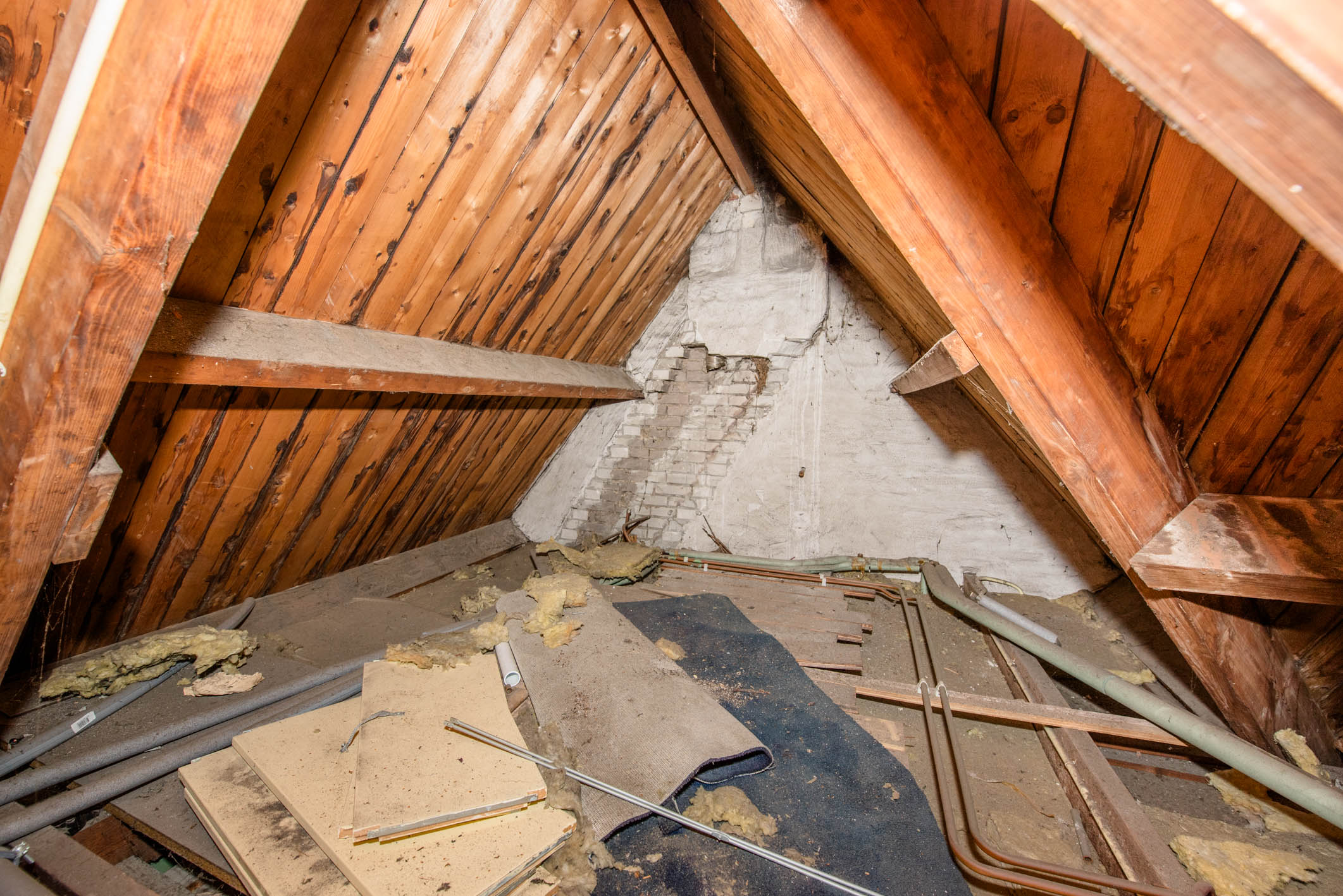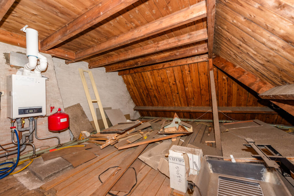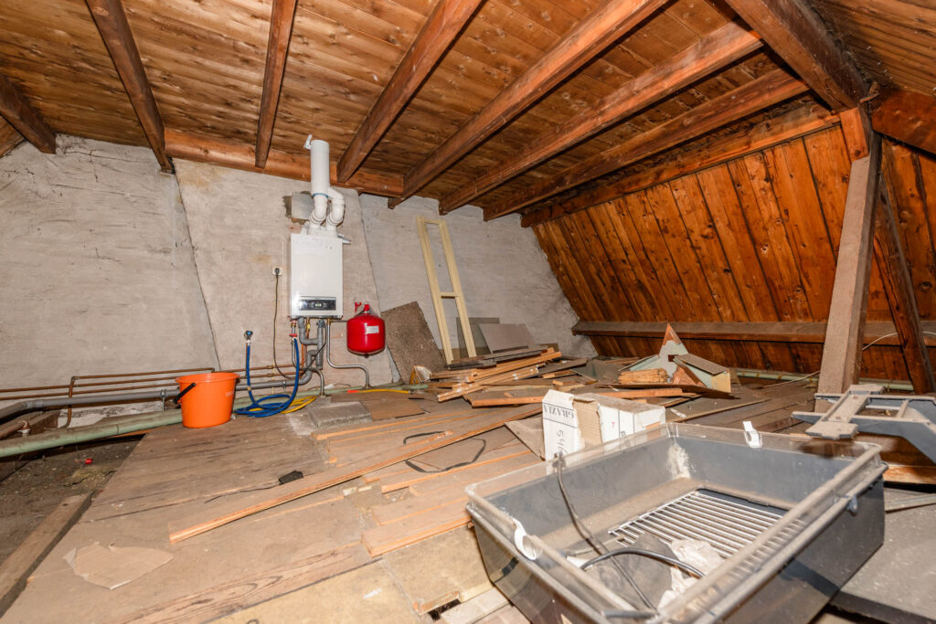 Via vlizotrap te bereiken bijzonder ruime bergzolder (ca 28 m2, hoogte ca 1,70 m), gedeeltelijk bevloerd.