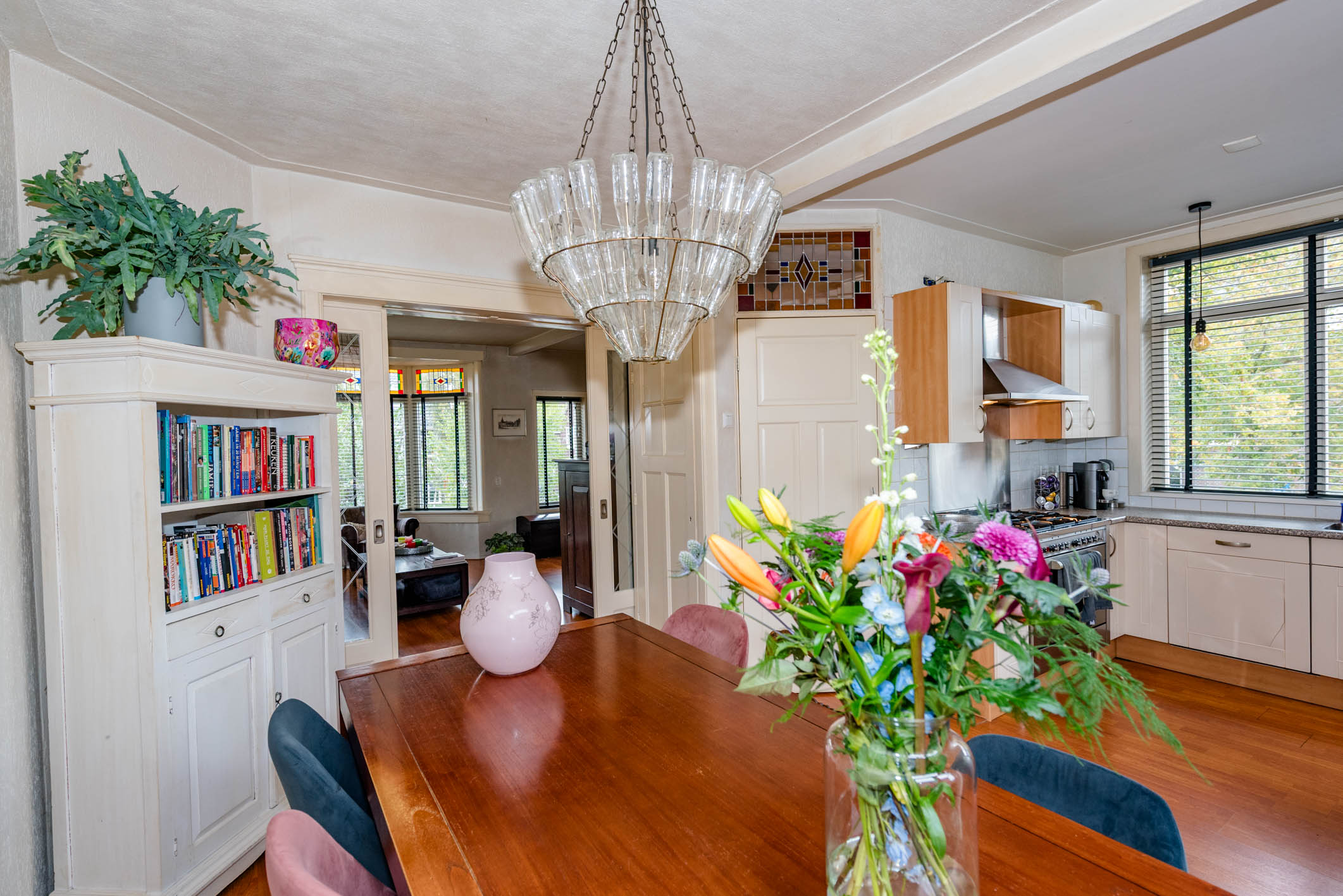 1e etage: overloop, toilet, ruime woonkamer-en-suite met erker en glas-in-lood, vaste kast, openslaande deuren naar balkon op het zuid-westen, nette open keuken met deur naar het terras op het zuid-westen