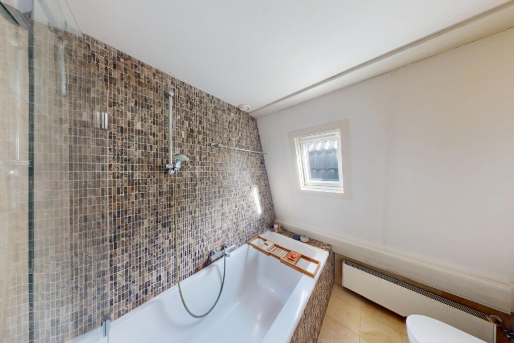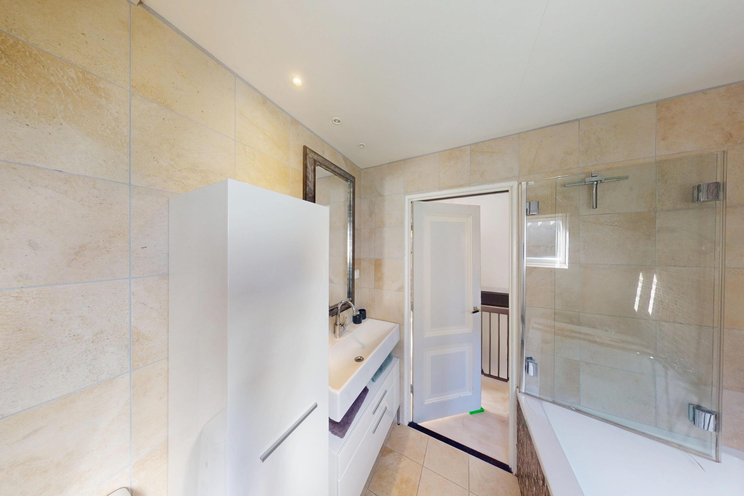 1e etageL overloop, moderne badkamer met bad, toilet en wastafelmeubel, 2 goede slaapkamers, veel vaste kasten